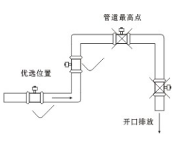 (4)流量計安裝位置介質(zhì)不滿時,可采取抬高流量計后端管路的方法,使其滿管,嚴(yán)禁在管道最高點和出水口安裝流量計。